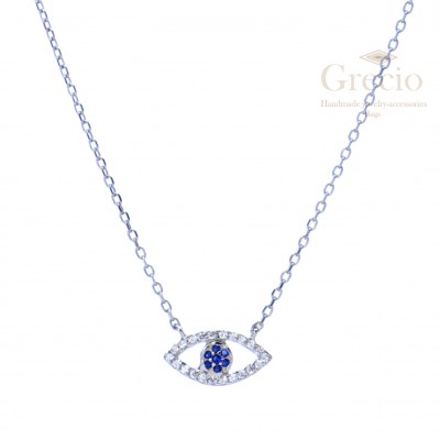 Κολιέ με οβάλ μάτι με άσπρα και μπλε ζιργκόν από ασήμι 925 . Διατίθεται σε ασημένιο, επιχρυσωμένο ροζ και κίτρινο χρυσό χρώμα. Το μήκος της αλυσίδας είναι 40-45 εκ.