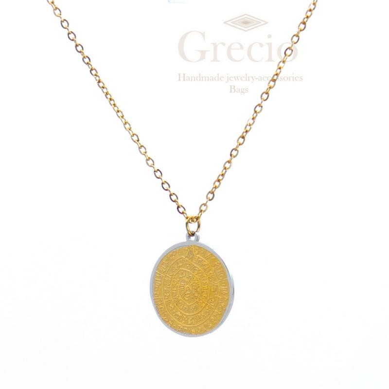 Κολιέ δίσκος της Φαιστού από ανοξείδωτο ατσάλι. Διατίθεται σε ασημί και επιχρυσωμένο κίτρινο χρώμα. Το μήκος του είναι 45cm (40cm το μήκος της αλυσίδας και 5cm extension).
