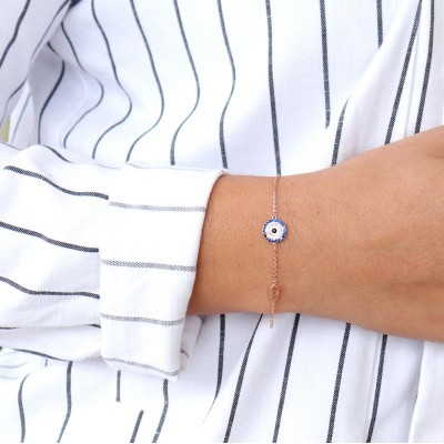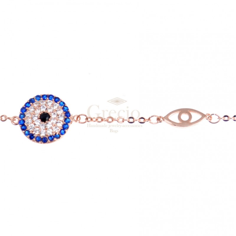 Βραχιόλι με μάτι σε σχέδιο στόχου διακοσμημένο με ζιργκόν και μάτι οβάλ από ανοξείδωτο ατσάλι. Είναι κατασκευασμένο από υποαλλεργικό υλικό και δεν αλλάζει χρώμα. Διατίθεται σε επιχρυσωμένο ροζ χρώμα. Το μήκος της αλυσίδας είναι 20-25 εκ.
