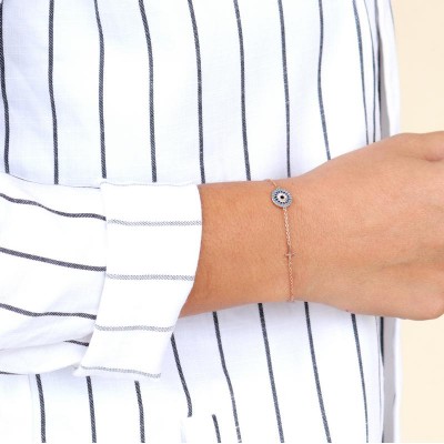 Βραχιόλι με μάτι σε σχέδιο στόχου διακοσμημένο με ζιργκόν και σταυρό από ανοξείδωτο ατσάλι. Ένα πανέμορφο κόσμημα που συνδυάζεται εύκολα με όλα σας τα outfit αλλά και με όλα σας τα κοσμήματα. Χαρίζει κομψότητα και λάμψη στο γυναικείο χέρι δίνοντας στυλ στις εμφανίσεις σας και κρατώντας τις κακές ενέργειες μακριά σας. Διατίθεται στους χρωματικούς συνδυασμούς που βλέπετε.
