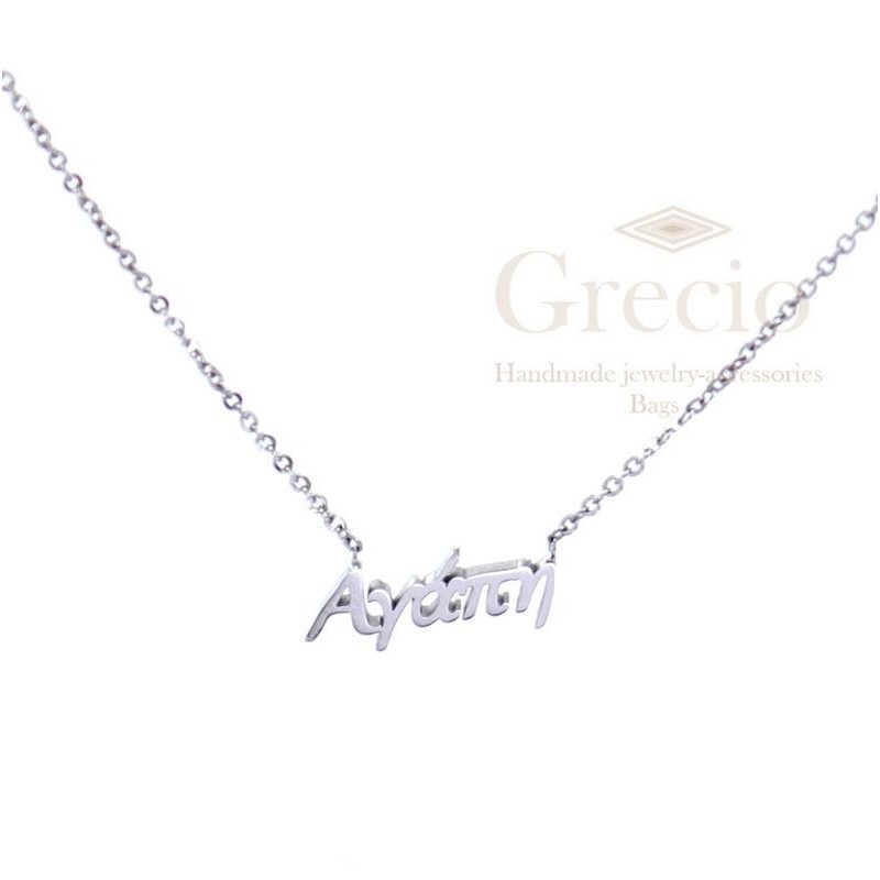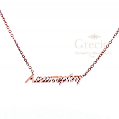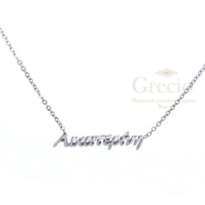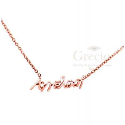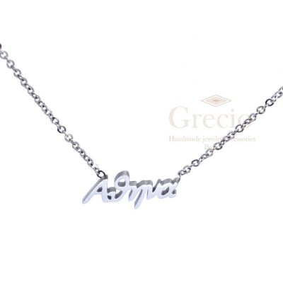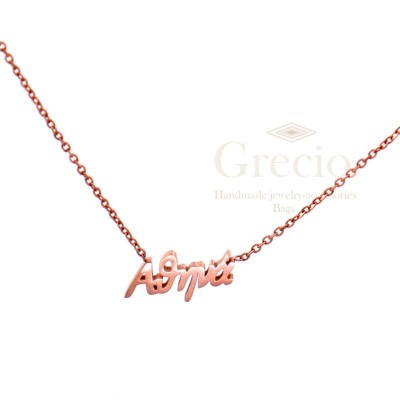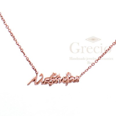 Κολιέ με τα ονόματα Αγάπη, Αγγελική, Αθηνά, Αικατερίνη, Αλεξάνδρα. Το υλικό τους είναι ανοξείδωτο ατσάλι και διατίθενται σε ασημί και ροζ επιχρύσωση. Το μήκος τους είναι 45cm (40cm η αλυσίδα και 5cm το extension).