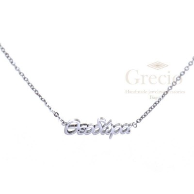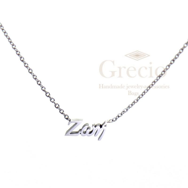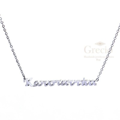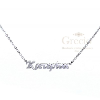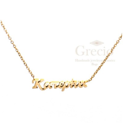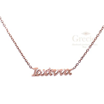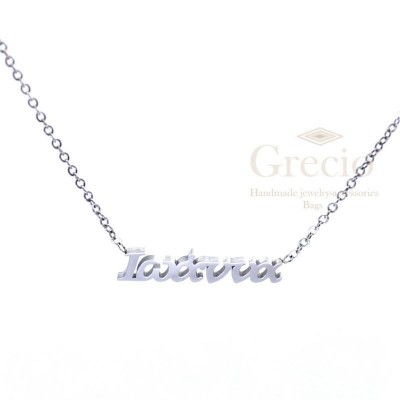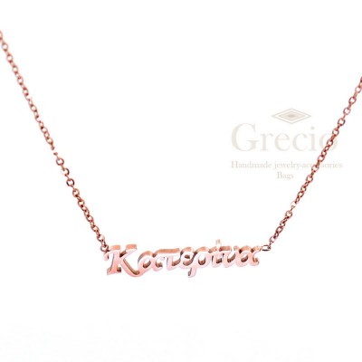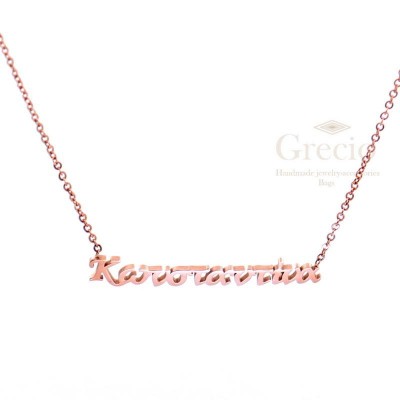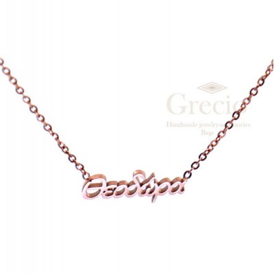 Κολιέ με τα ονόματα Ζωή, Θεοδώρα, Ιωάννα, Κατερίνα, Κωνσταντίνα. Το υλικό τους είναι ανοξείδωτο ατσάλι και διατίθενται σε ασημί και ροζ επιχρύσωση. Μόνο το Κατερίνα διατίθεται σε χρυσό. Το μήκος τους είναι 45cm (40cm η αλυσίδα και 5cm το extension).