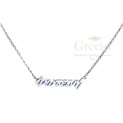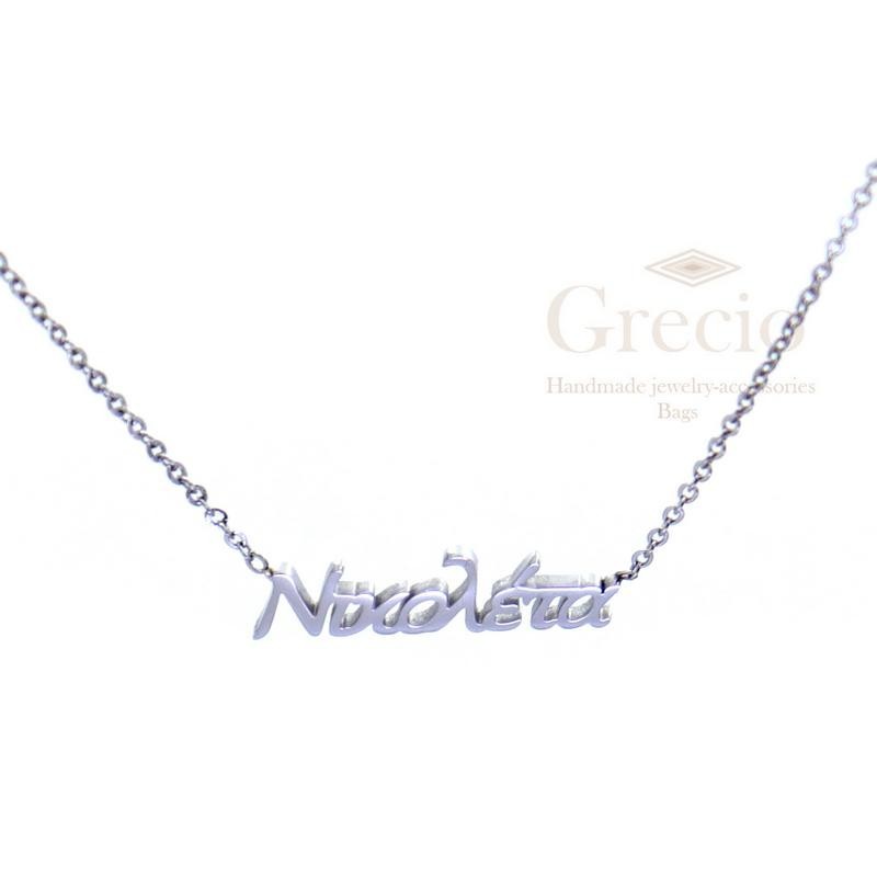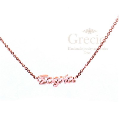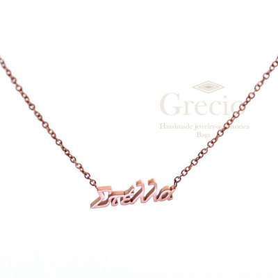 Κολιέ με τα ονόματα Νικολέτα, Σοφία, Στέλλα, Φωτεινή. Το υλικό τους είναι ανοξείδωτο ατσάλι και διατίθενται σε ασημί και ροζ επιχρύσωση. Το μήκος τους είναι 45cm (40cm η αλυσίδα και 5cm το extension).