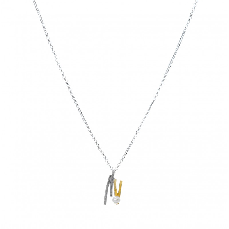 Χειροποίητο κολιέ με μαργαριτάρι και γεωμετρικά σχήματα από ασήμι 925ο. Διατίθεται σε συνδυασμό ασημένιου χρώματος και κίτρινης επιχρύσωσης . Μήκος αλυσίδας 43 εκ.