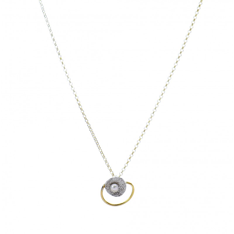Χειροποίητο κολιέ με μαργαριτάρι και γεωμετρικά σχήματα από ασήμι 925ο. Διατίθεται σε συνδυασμό ασημένιου χρώματος και κίτρινης επιχρύσωσης . Μήκος αλυσίδας 43 εκ.