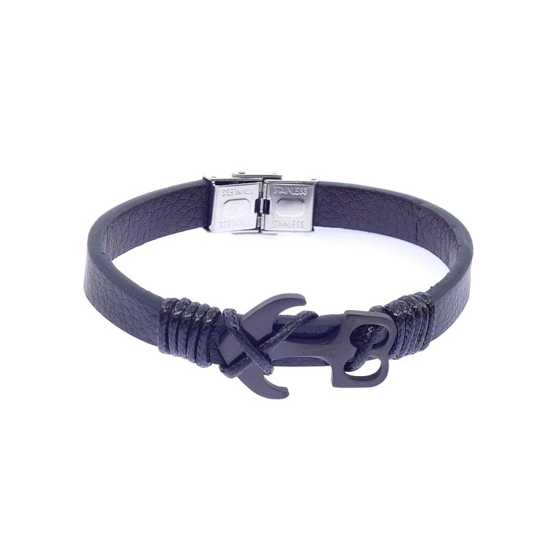 Ανδρικό βραχιόλι φτιαγμένο από δερμάτινο λουράκι και διακοσμημένο με μεταλλική άγκυρα από ανοξείδωτο ατσάλι σε μαύρο χρώμα.