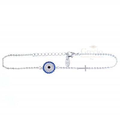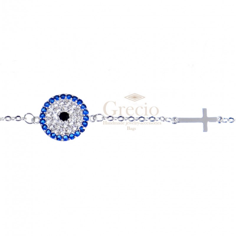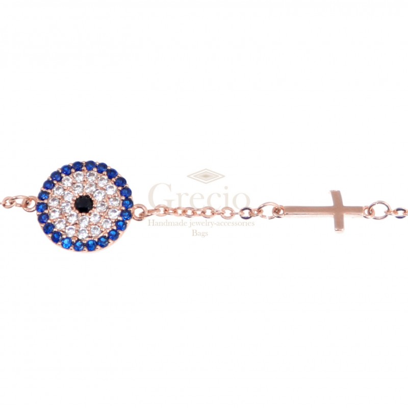 Βραχιόλι με μάτι σε σχέδιο στόχου διακοσμημένο με ζιργκόν και σταυρό από ανοξείδωτο ατσάλι. Είναι κατασκευασμένο από υποαλλεργικό υλικό και δεν αλλάζει χρώμα. Διατίθεται σε ασημί και επιχρυσωμένο ροζ χρυσό χρώμα. Το μήκος της αλυσίδας είναι 20-25 εκ.
